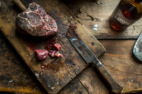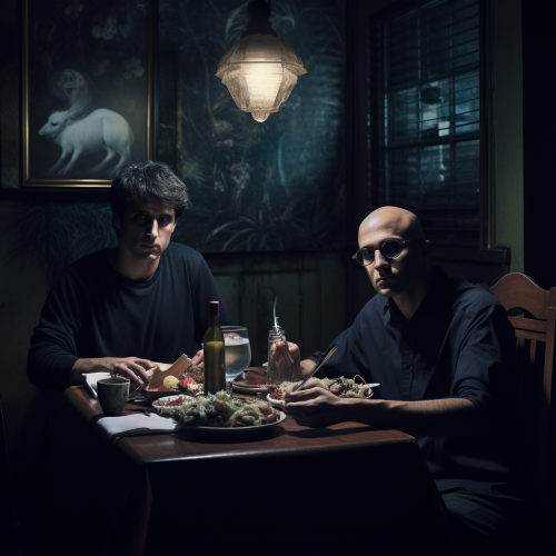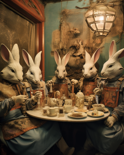 Four Sideshow Fireman carnivale Men-rabbits earing an opulent meal in the Secret Submarine Supper Club, Tekkonkinkreet Carnivale aesthetic by Eugene Atget, --ar 4:5