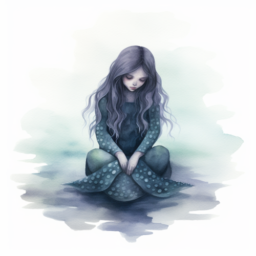 creepy mermaid is sitting and hugging her knees watercolour illustration, dark pastel colours, creepy mermaid, minimalist style, white background--iw 2