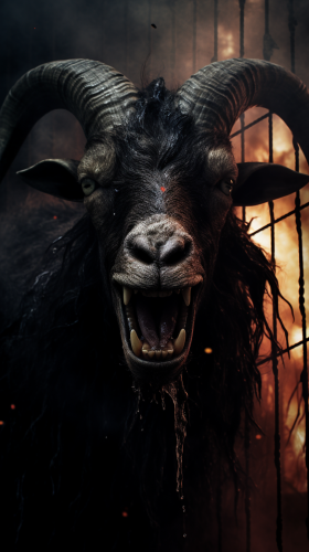 photo realistic, canon 5d, hyper detailed, dynamic light, low angle, fenced yard, dirty background, dusty, fire, face us is a death metal horned black goat, --ar 9:16