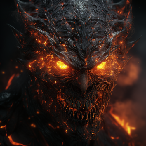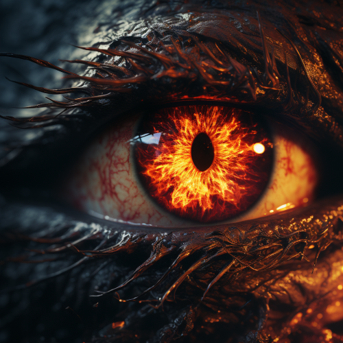 a close up shot of a handsom demon-man hybrid with sharp squinted demonic glowing orange fiery eye with a extremely angry furious thin demon pupil surrounded by fiery face markings and orange flames, 4k, ultra detailed, vibrant, mystical, beautiful, intense --s 250