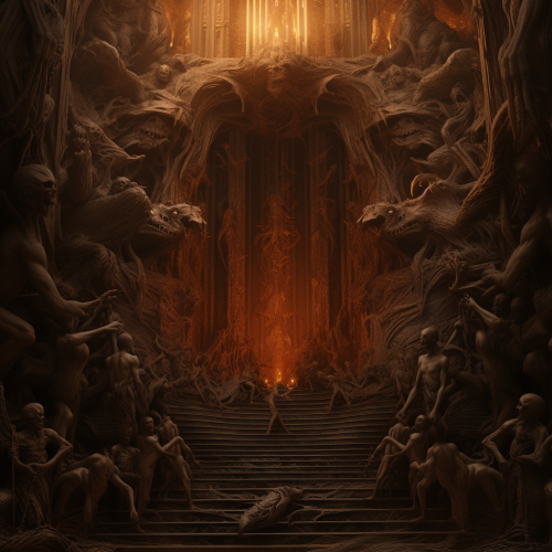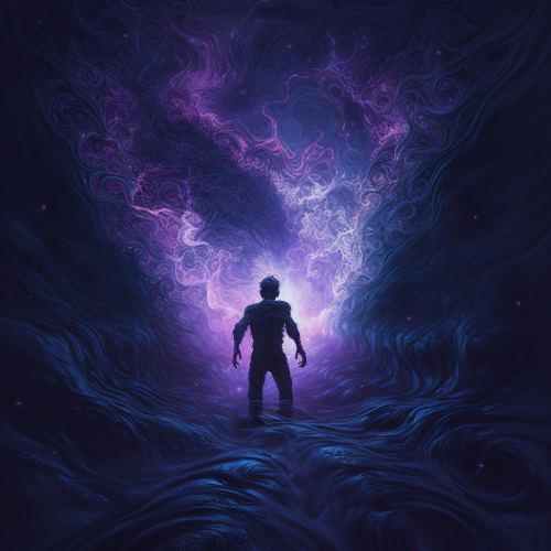a demon approaching on a purple night within a dark and psychedelic background black marble effects melting in purple and blue colors, 4k resolution