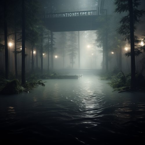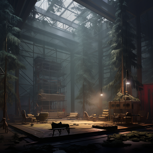 large soundstage movie studio, flooded, with foggy forest inside, artificial lighting, rendered in unreal engine