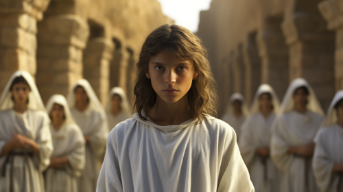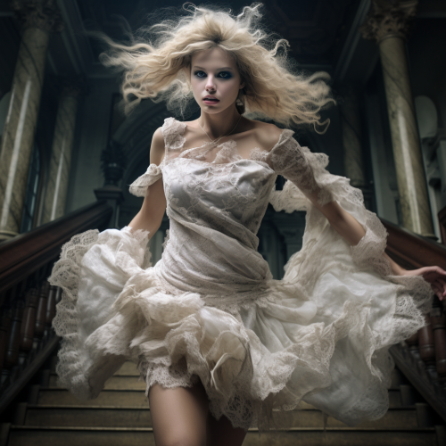 glamourous and powerful blonde young woman running away from lace fabric monsters. She wearing a short dress with victorian detail with an open decolletage with rhinestone and pearl embroidery and modern lace trims.