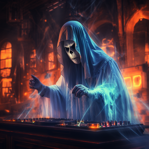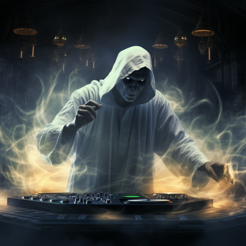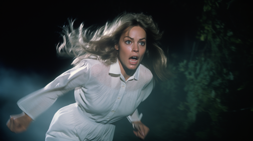 movie still, style by 1970 horror film, moody lighting, hysterical woman running in dark from evil ghost, medium wide shot, --ar 16:9 --seed 4000