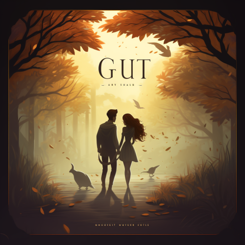A cover design that conveys the theme of Ghost, a novel has action adventure and mystery, A Love story of Human and Ghost, A puritan man tall, dark brown curling hair, square chin, and brown eyes, six feet tall and woman with Charity auburn hair, tall, well proportioned, with strong limbs, hazel eyes, and a cherubic round face. perhaps on a wooded path-- in the background a rustic Georgian styled farm house with two chimneys, Photorealistic, Photoreal