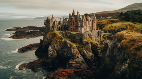 Aerial photography of a manor on a cliff in scotland. The manor is in the style of gothic architecture with biomorphic elements. The manor is sinister. Designed by Antoni Gaudí and wes anderson --ar 16:9