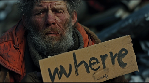 homeless man holding a cardboard sign "where gun?" --ar 16:9 --v 6.0