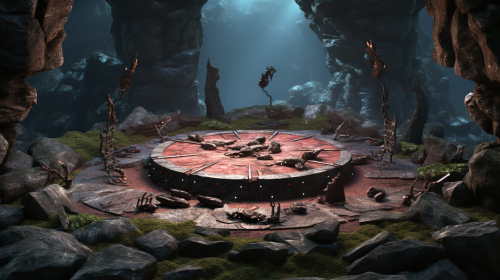 magic circle of stones in the jungle, surrounded by chunks of meat scattered across the area but centered on the middle of the circle. photorealistic, highly detailed, --ar 16:9