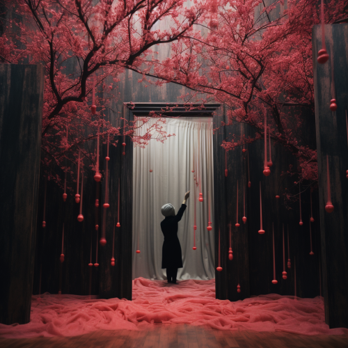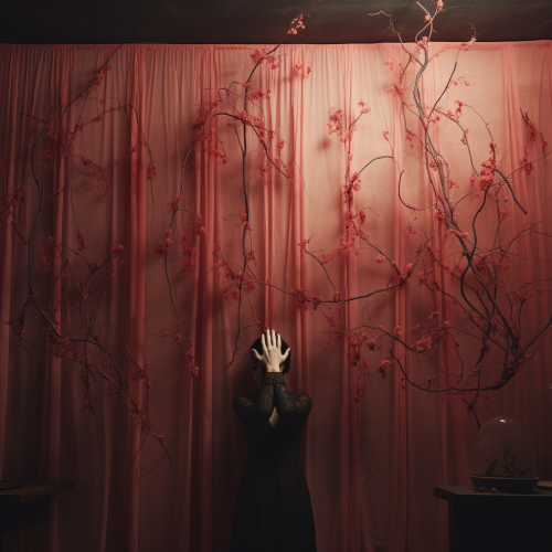 a lynchian interior design of a room with no people, pale pink cherry blossom small petals float in the air, big hands come from the walls, red curtains and red roots. Unsettling mood, dramatic, moody, surrealistic, lynchian, cinematic style