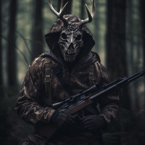 realistic photograph of a man wearing a wendigo skull in a dark forest holding a rifle