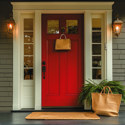cardboard wreath handing on ornate door, beautiful gold room with mirrors, festive, side table with beauty products, warm light --style raw --v 6.1 --s 250