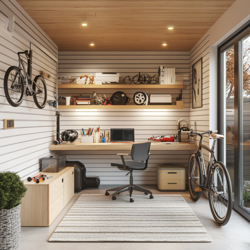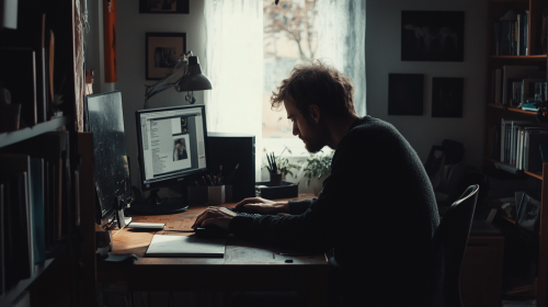 Generate a digital art for A digital art scene depicting a person sitting in a quiet, well-lit room with a tidy background. The room has a professional setup with a desk, computer, and minimalistic decor. The lighting is soft and even, creating a calm and focused atmosphere. Use shades of navy blue for the background and elements to convey professionalism and tranquility. --ar 4:3