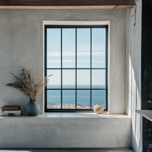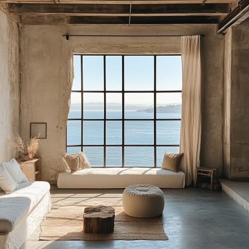 A detailed photo showing the window of a warehouse loft apartment. The window is medium size and overlooks the ocean in the distance below. The decor inside is tasteful and minimalist.