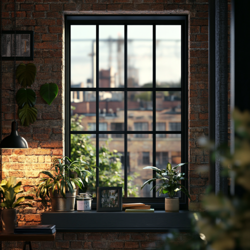 A detailed photo showing the window of a warehouse loft apartment. The window is medium side and overlooks greenery. The decor inside is tasteful, modern and playful.