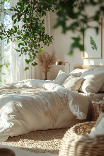Create a highly realistic image of a cozy bedroom. The room should feature soft lighting, with warm tones and natural elements. Include a plush bed with layered blankets and pillows, a bedside table with a small lamp emitting warm light, and personal touches like a book, candle, or a cup of tea. The walls can have subtle textures, art, or soft neutral colors. A large window with light curtains allows natural light to gently filter in, adding to the inviting atmosphere. Use elements like a rug, plants, and wooden furniture to enhance the comfort and warmth of the space. The overall mood should evoke relaxation, serenity, and coziness. No text should be included. --ar 16:9 --v 6.0 --s 750
