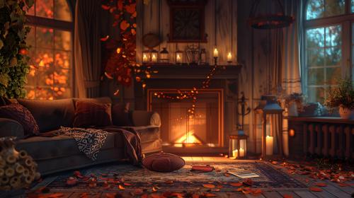 Ultra-realistic photo of a soothing, cozy interior, capturing the warmth and tranquility of an autumn evening spent by the fireplace. The room is softly lit by candles and lanterns, with warm tones of autumnal colors like deep oranges, browns, and golds. The flickering glow from the fireplace casts gentle shadows, creating an inviting atmosphere. The ambiance evokes the peacefulness of falling leaves, the gentle crackle of burning candles, and the comforting, reflective mood of a quiet, serene evening. 8k --ar 16:9 --s 750 --v 6.0