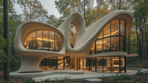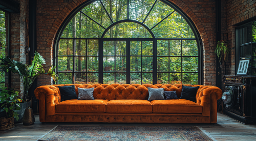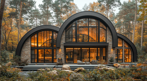 exterior of a stunning house with arched window and large windows overlooking the forest, featuring luxurious velvet sofas in warm tones. The space is adorned with brick walls, creating an elegant ambiance. Captured using a Canon EOS R5 camera with a wide-angle lens, showcasing a grandeur that emphasizes the spaciousness of the exterior. --ar 128:71 --q 2 --s 750