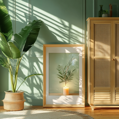 Large picture frame with previous photo inside and candle in the middle of wardrobe; product shot; bohemian interior with plants; green walls; sunny and bright lighting; very realistic
