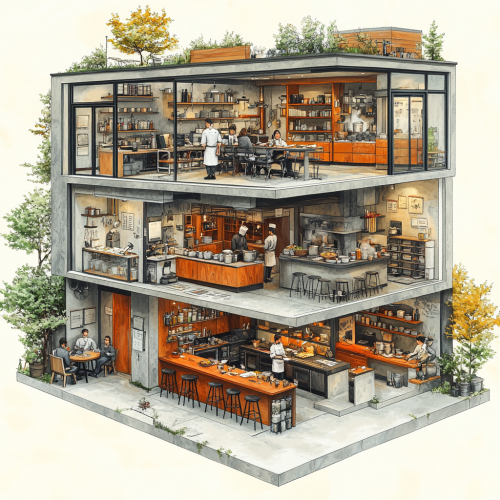 foyer, reception counter made of concrete with a table top in light maple wood in front of high wall cabinets in concrete look. The high wall cabinets are in line connected to a kitchen unit on the left side. the cupboards of the kitchen unit have the same concrete look like the wall cabinets behind the counter. kitchen worktop and fittings are black. hanging industrial pendant lamps. overall industrial style. --v 6.1