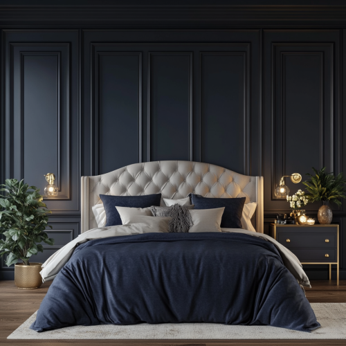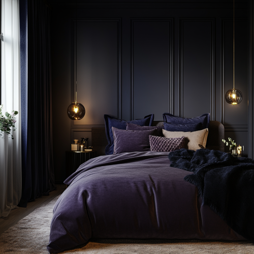 Bright yet moody chic luxury bedroom with a sophisticated, high-end atmosphere. Use a rich color palette with the following hex codes: Jacarta #3F2A52, Dark Blue-Gray #75619D, Wisteria #BEAEDB, Bright Gray #E6EFF7, Black Coffee #3A2D34, and Gold #D4AF37 for a touch of glam. Add soft natural lighting to brighten the space subtly. Features include a plush upholstered headboard, silky bedding, textured velvet accents, gold hardware, and delicate light fixtures. Incorporate greenery and refined decor for an airy, balanced luxury feel with cozy yet luminous ambiance.