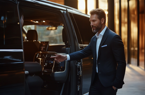A close-up shot of the male driver opening his big SUV door, wearing formal attire and holding out an open hand to assist with outside access. The scene is set in front of a luxury vehicle within a well-lit indoor setting. He appears professional yet welcoming as he opens the rear passenger-side doors, showcasing modern elegance. This composition captures your journey into the interior space of the high-end automotive experience. --ar 61:40