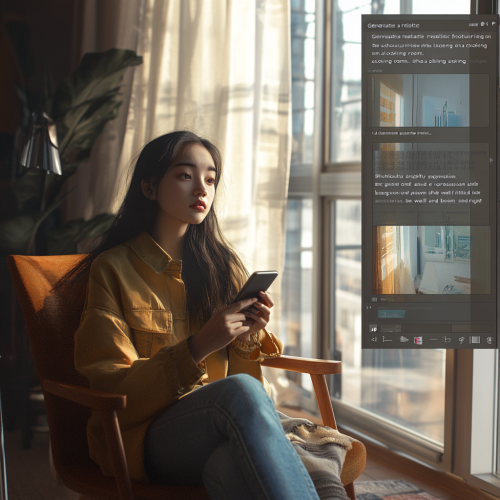"Generate a realistic photo featuring a teenage Japanese girl sitting on a chair in a living room. She should be holding a smartphone and looking out the window with a slightly surprised expression on her face. The living room should be well-lit and bright, clearly indicating it is daytime. Emphasize the natural daylight streaming through the windows to create a warm and inviting atmosphere. Ensure the details of the room, such as furniture and decor, are visible but not overpowering. The girl should have distinctive Japanese facial features and appropriate attire for a casual indoor setting. The overall image should appear as a high-quality, realistic photograph."