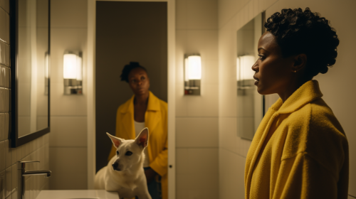 a wide shot photograph of a beautiful black woman in her 40's in her bathroom that is upscale and brightly lit. we see the entire bathroom and the woman head to toe. there is another woman in a bright yellow lab coat standing in the bathroom as well. The black woman is surprised to see her there. --ar 16:9 --v 5.0 --s 750