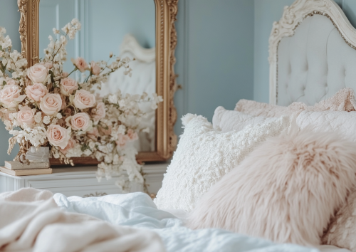 A romantic and elegant bedroom in soft pastel blue tones with a vintage bohemian style. Featuring an ornate gold-framed mirror, a lush bouquet of pink and cream roses on a bedside table, and a bed with fluffy, textured throws and pillows in shades of blush pink and cream. The walls are a soft pastel blue, creating a calming ambiance, with delicate floral details scattered around the room. The scene is serene, cozy, and has a touch of antique luxury with subtle boho accents. --ar 7:5
