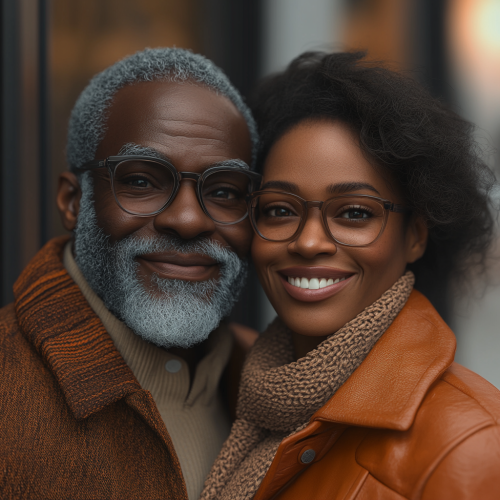 55 year old black family love. This photo was taken using Canon EOS R5 mirrorless camera, with an EF lens set to f/20, ISO 8D, capturing every detail of his smile and her warmth., ultra-realistic photograph captured, high-resolution 3d rendering --v 6.1