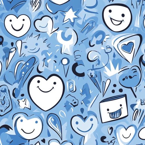 an abstract background design consisting of overlapping smiley faces, hearts, lightning bolts, and other cute graphics in cornflower blue, white and silver