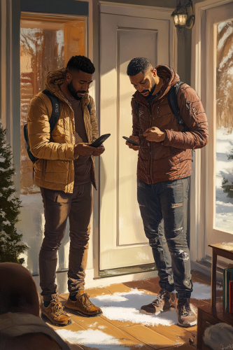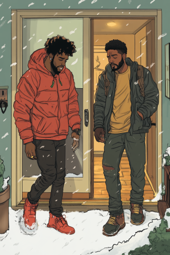 an African American gay couple, one of them is walking out the front door, he is wearing outdoor winter clothing, the other is looking at his phone, and he is crying in the living room wearing causal winter clothing, --ar 2:3