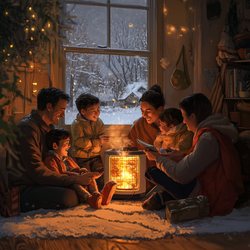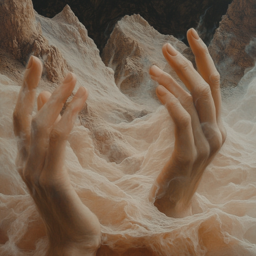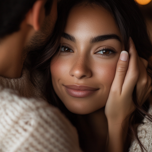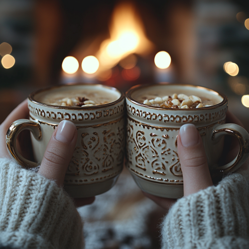 Close-up of a couple’s hands holding mugs in a cozy winter setting by a fireplace. Only the hands and mugs are visible, with no faces or identifiable people in the frame. The scene is softly lit by the warm glow of the fire, with hints of Christmas decorations and candles in the background for a festive, intimate atmosphere. Focus on the texture of the sweaters and the warmth of the moment, with a gentle bokeh effect to enhance the cozy feel --style raw --s 750