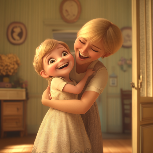 A cute little girl, dressed in light yellow and gray tones with blond hair, laughs with gusto as she clings to her mother's neck inside the house. The woman has short, straight blond hair and wears an elegant dress, while her expression shows that she feels happily surprised, in Pixar's style. This scene captures their emotional interaction through high-definition photography.