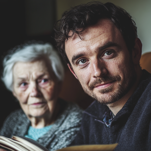 Portrait of a 30-year-old man looking in camera. He is sitting next to an elderly person, looking in a book. Focus on authentic, happy moments. Lighting should be natural and bright. The settings should feel familiar and comforting, such as home care environments or serene care facility spaces. background is not sharp . Avoid overly staged or clinical imagery; aim for authenticity and an emotional connection with the audience. --v 6.1