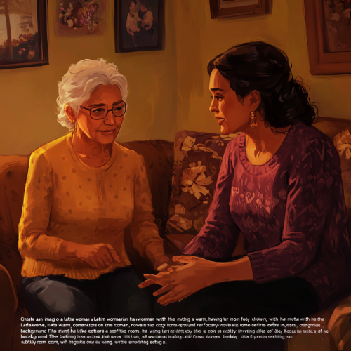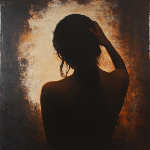 A Latina woman with loose hair, walking gracefully, with only her back visible. Her partner’s hand is gently resting on her back, conveying a sense of comfort and support. In contrast, another hand is pulling lightly at some strands of her hair, adding a layer of tension to the scene. The focus is on the woman, emphasizing her figure and the intimate connection, with a soft and inviting background that enhances the warm, loving atmosphere.