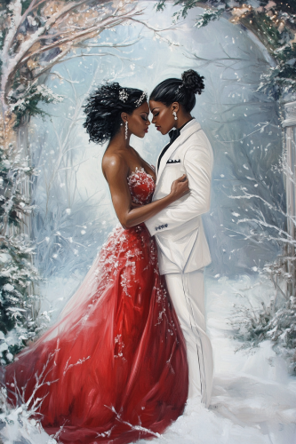 an African American lesbian couple at a winter ball, one of the women are wearing a beautiful red dress, the other woman is wearing a white tuxedo and her hair is in a ponytail, they are holding each other under a mistletoe in a beautiful archway, --ar 2:3