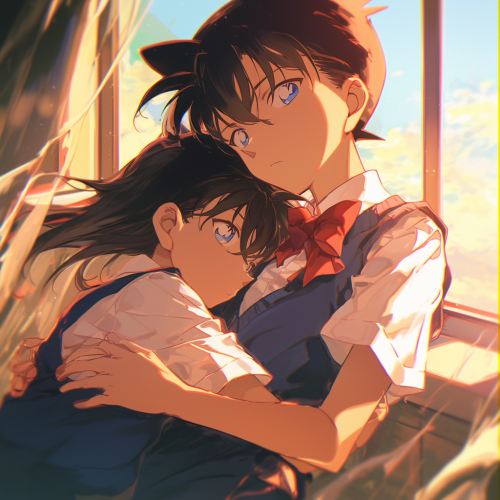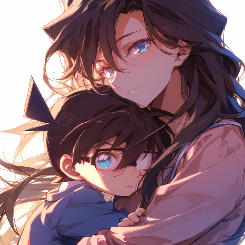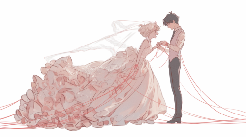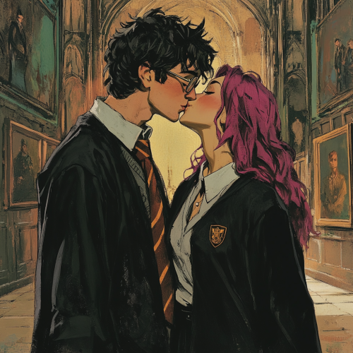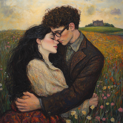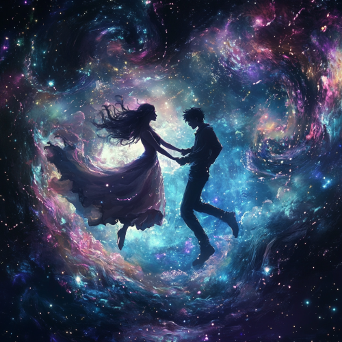 a romantic cosmic scene showing a boy and a girl reaching out to embrace across the vastness of space. The girl should have flowing hair and a graceful silhouette, wearing a flowing dress that seems to merge with the cosmos. The boy should have a strong but tender pose, his clothing also rippling in the cosmic winds. They are both floating in space, their bodies leaning toward each other with outstretched arms, just moments away from embracing. Between them, visualize a powerful gravitational force represented by streams of iridescent light in purples, blues, and pinks that swirl and spiral around their bodies, drawing them together. Their figures should be surrounded by a soft, ethereal glow - hers in a gentle pink aura, his in a serene blue. The background should be a deep space scene with twinkling stars and a subtle nebula in romantic purples and blues. Add small particles of light that float around them like cosmic fireflies, emphasizing the magical nature of their connection. The overall composition should capture both the physical attraction of gravity and the emotional magnetism between them, creating a sense of destiny and cosmic love. Mike Mignola style