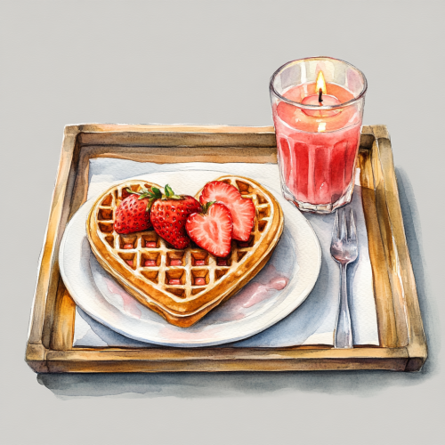 highly detailed watercolor clipart of a beautiful Valentine's breakfast consisting of a heart-shaped waffle with sliced strawberries on a porcelain white plate, next to it a glass of strawberry juice and a pastel candle, all laid out on a wooden breakfast tray, naturally composed, soft colors, luxurious aesthetics ,beautiful illustration with realistic details, high resolution, gray background