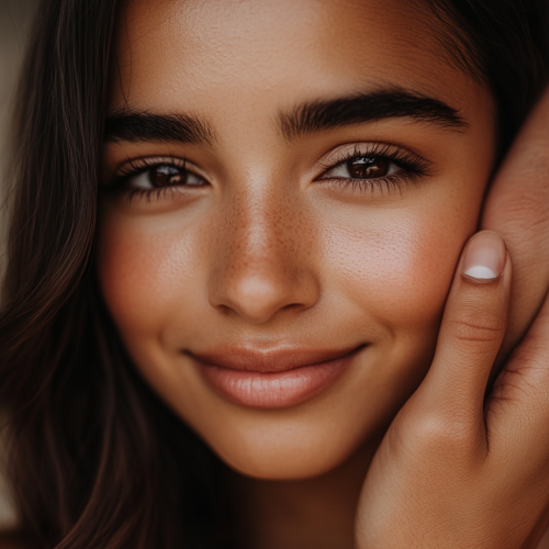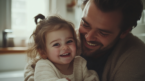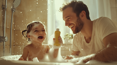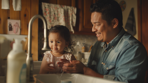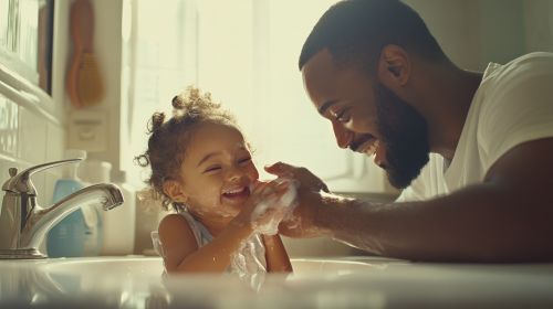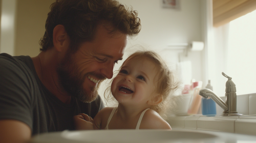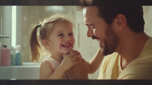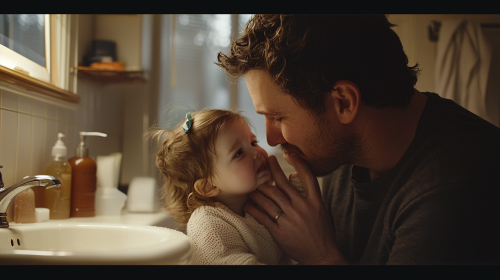 A tender moment of a father gently wiping away the tears of his 2-year-old daughter in their home bathroom. Both father and daughter have joyful expressions, as if sharing a comforting and lighthearted moment together. The bathroom is cozy, with familiar items around the sink, creating a warm, intimate atmosphere. The father’s gentle smile and the little girl’s playful, relieved expression capture the love and closeness between them, highlighting a caring and affectionate bond. --ar 16:9 --style raw --personalize 5rv55fv --stylize 250 --v 6.1