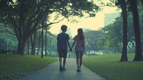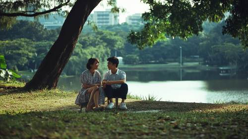 A 28 year old Singaporean boy with his female friend in a Singapore park looking blissful, healthy relationship, realistic, 35mm colour film photography feel, --ar 16:9