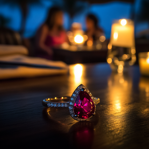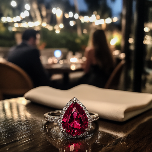 a pear shape shiny ruby engagement ring with diamond trillion accents in 18k white gold - a photograph where this ring is the focus - dramatic lighting - they are sitting at an ourdoor patio of a romantic restaurant - the couple is sitting at the table looking very happy and she is staring at the ring as though she is seeing it for the first time