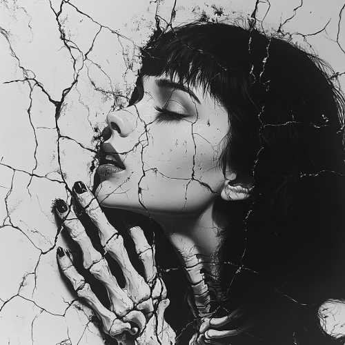 woman, loving a skeleton, detailed and realistic drawing, shattered glass, porcelain cracks black and white drawing, white background with skeleton hand --s 750 --v 6.1