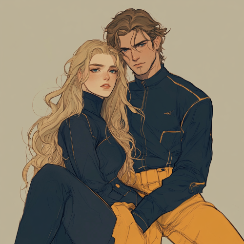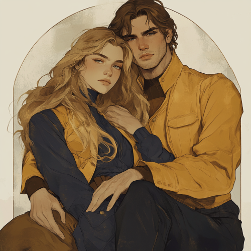 woman with long blonde hair is sitting on a man with brown mullets shoulder. She is wearing a dark blue outfit with pants and long sleeve. He is wearing a similar outfit in yellow tones. Utilitarian outfits. Utopian outfits.