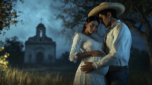 A 20-year-old Mexican farmer wearing a straw hat and traditional white peasant clothing wraps his hands around the belly of a pregnant priestess nun, who is 48 years old. In the background, there is an old ruined church. The atmosphere is nighttime with fog. Photorealistic quality. --ar 16:9 --v 6.1 --style raw