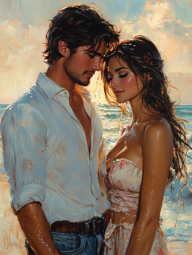 A man and woman walking hand in hand along a peaceful beach at sunset, the man in a crisp white shirt and jeans, the woman in a soft, flowing dress. The golden sunset casts a warm glow over them, while gentle waves lap at the shore, creating a romantic and intimate mood. --ar 16:9 --stylize 750