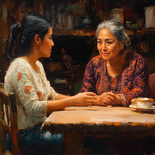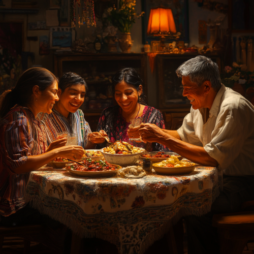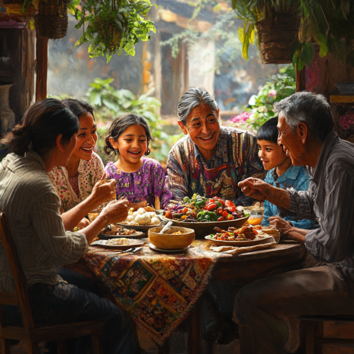 Hyperrealistic scene of a Guatemalan Ladino family gathered around a dining table, sharing a joyful moment together. The family is smiling, engaging in conversation, and enjoying a meal. Warm lighting fills the room, highlighting the details of their faces and the traditional Guatemalan dishes on the table. The background shows a cozy, modest kitchen with natural wooden furniture and traditional Guatemalan decor. The atmosphere is filled with happiness, love, and togetherness, capturing the essence of a close family sharing quality time. --s 250