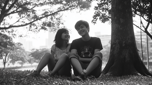 A 28 year old Singaporean boy with his female friend in a Singapore park looking blissful, healthy relationship, realistic, 35mm film photography feel, --ar 16:9