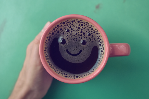 cup of black coffee in a pink mug with a few bubbles on the surface of the coffee making a smily face, on a clean green table hand holding handle of mug --ar 3:2