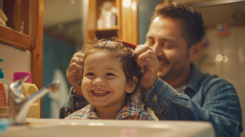 A heartwarming scene of a Hispanic father styling his 2-year-old daughter’s hair in front of a bathroom mirror. The father, smiling warmly, carefully brushes his daughter’s hair as she grins happily, looking at her reflection. The bathroom setting is cozy and inviting, with small touches of everyday life visible around the sink. Both father and daughter share a joyful moment, their expressions full of love and connection, capturing the tenderness of a simple bonding ritual.
