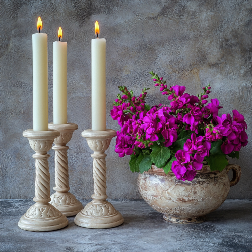 2 Shabbat candles on beautiful cream candlesticks. 2 beautiful braided chalatas with a pot with flowers in a strong fuchsia pink color. Artistic style
